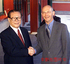 中歐十九日達(dá)成中國入世協(xié)議后,江澤民主席在會(huì)見歐盟貿(mào)易委員拉米一行。 2000年5月19日 21:21 ![]() 中國與歐盟十九日達(dá)成了中歐之間關(guān)于中國加入世貿(mào)組織的雙邊協(xié)議后,國家主席江澤民在北京中南海會(huì)見歐盟貿(mào)易委員拉米一行。 |