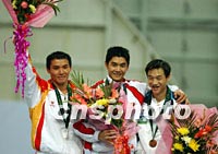 圖:邢傲偉獲得男子自由體操冠軍 2001年11月18日 22:13 ![]() 奧運(yùn)明星邢傲偉十八日在九運(yùn)會(huì)男子自由體操比賽中獲得冠軍,盧裕富、楊威分別獲得第二、三名。中新社記者 張宇 攝 |