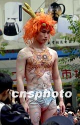 圖:模特赤身二月寒風(fēng)中展示人體彩繪 2002年02月05日 10:19 ![]() 廣州一名男模特赤體在二月寒天中展示身上的彩繪,意在祈望新春的人們更具“龍馬精神”。中新社記者 梁永強(qiáng) 攝