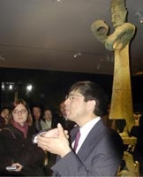 三星堆青銅器亮相紐約大都會(huì)博物館(多圖) 2002年03月06日 10:06 ![]() 鑲有金箔的青銅頭像是四川三星堆出土、公元前十三世紀(jì)的珍貴文物。 ![]() 紐約大都會(huì)博物館亞洲部副主任孫志新博士,向人們解說(shuō)首次在美國(guó)亮相的中國(guó)四川三星堆青銅器的特點(diǎn)。 中新社紐約三月四日電(記者 陳建)天藍(lán)色的廣告旗幟今天懸掛在紐約大都會(huì)博物館正門外,告訴人們展現(xiàn)中國(guó)古蜀文化的珍寶將于三月六日至六月十六日在這里展出。這些展品中最令人驚嘆的,莫過(guò)于從四川三星堆出土、約三千年前的青銅器。 走進(jìn)一樓展廳,最先看到的是一尊寬一米三八、高六十六厘米的U型青銅面具。沒(méi)有溫柔的背景光源,只有幾束強(qiáng)光從不同角度打在線條粗獷的面具上,留下明顯的陰影。面具形象與傳統(tǒng)的中國(guó)人差異很大——粗眉、大眼、高鼻、闊嘴,眼珠的位置上還釘著楔子!面具后,是一面高大的黑色背景板,上面用淺灰色的字寫著:“寶藏源自一個(gè)消失的文明”。 這就是從四川中部三星堆遺址中出土的青銅器,鑄造年代大約是公元前十三世紀(jì),比中原地區(qū)的青銅器普遍早幾百年。那時(shí),地球上的絕大部分地區(qū)還處于蠻荒時(shí)代。迄今,全世界的專家都弄不清楚,三星堆青銅器高超的冶煉技術(shù)是從哪兒來(lái)的?古蜀國(guó)是怎么產(chǎn)生、持續(xù)多久、為什么又突然消亡了? 不過(guò),古蜀文明雖然看上去有暴戾、兇悍和屬于靈鬼的一面,但展品中,人們也能找到許多纖美、甚至世俗的特征。一棵青銅鑄造、攀龍附鳳、綴滿銅錢的“發(fā)財(cái)樹”就精美得幾近繁瑣。另外一尊全高兩米六、細(xì)細(xì)長(zhǎng)長(zhǎng)的青銅人像,雖然也是粗眉、大眼、高鼻、闊嘴、兩支大耳朵上明顯地穿了能帶耳環(huán)的“耳洞”,但面目祥和許多,眼睛上也沒(méi)釘楔子。 據(jù)說(shuō),那尊青銅人像是世界上現(xiàn)存最高的青銅像。銅像兩手一高一低,好像握著什么東西。專家推測(cè),因?yàn)樘?xì)太高,銅像站在那里,如果手中再稍有負(fù)重,肯定會(huì)摔倒。 本次四川古代藝術(shù)展共有一百二十八件文物,除青銅器外,還有玉雕、石雕等。 據(jù)紐約大都會(huì)博物館亞洲部副主任孫志新博士介紹,本次展覽是近年來(lái)唯一一次展示四川一個(gè)地方從公元前十三世紀(jì)到公元三世紀(jì)約一千五百年間的文化源流與演變,對(duì)于向世人集中介紹中國(guó)文化的起源、中國(guó)古代文明的形象具有非常重要的意義。 據(jù)悉,在紐約展完后,這些珍貴文物還將到多倫多展出四個(gè)月。