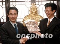 圖文:臺北孔廟訪問團(tuán)一行三十六人來滬交流 2002年03月20日 06:03 ![]() 前來參加此間滬臺兩地“佾舞文化交流”活動的臺北市“民政局長”林正修,今日上午參觀了上海文廟。圖為林正修(圖左)在參觀中。中新社圖 湯彥俊 攝