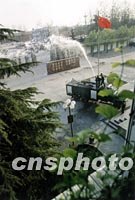 北京大興武警后勤基地消防隊,三月結(jié)合消防演練任務(wù),派消防車一邊給大樹澆水,一邊訓(xùn)練消防動作,一舉兩得。中新社圖 曹文 攝