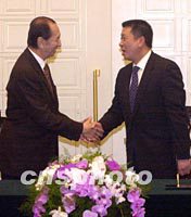 ![]() 澳門(mén)特區(qū)政府與澳門(mén)博彩股份有限公司二十八日簽署博彩經(jīng)營(yíng)批給合同,圖為行政長(zhǎng)官何厚鏵與澳博公司董事長(zhǎng)何鴻燊在簽約完成后互相握手。中新社記者 宗金柱 攝