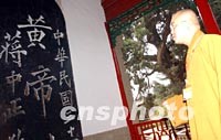 圖:佛指舍利迎歸團參觀黃帝陵 2002年04月02日 09:38 ![]() 佛指舍利迎歸團成員一日到陜西黃陵參觀黃帝陵。圖為寬池法師在軒轅廟中的蔣介石題詞前駐足。中新社圖 武仲林 攝