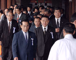 繼小泉后日本88名國會(huì)議員集體參拜靖國神社(圖) 2002年04月23日 10:26 ![]() 日本國會(huì)議員集體參拜 中右為自民黨干事長山崎拓 中新網(wǎng)北京4月23日消息:由日本保守派議員組成的“大家都來參拜靖國神社國會(huì)議員會(huì)”的成員今天上午集體參拜了靖國神社。 據(jù)共同社報(bào)道,自民黨干事長山崎拓、保守黨干事長二階俊博和民主黨的小林憲司等88名參眾兩院議員,91名國會(huì)議員的代理人以及國家公安委員長村井仁參加了靖國參拜。 日本首相小泉純一郎21日上午突然參拜了靖國神社,引起中國和韓國政府的強(qiáng)烈不滿和抗議。 位于東京九段北的靖國神社內(nèi)供奉著日本明治維新以來歷次對(duì)外戰(zhàn)爭中246萬多戰(zhàn)死者的牌位,其中包括東條英機(jī)等甲級(jí)戰(zhàn)犯。
