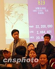多圖:神秘青年天價買走宋徽宗《寫生珍禽圖》 2002年04月23日 22:36 ![]() 宋徽宗親筆畫《寫生珍禽圖》二十三日在北京拍賣會上以兩千三百萬元人民幣的天價創(chuàng)下中國古字畫的最高價格。圖為激烈的競拍場面。中新社圖 武仲林 攝 ![]() 一位不愿透露身份的神秘人物二十三日在北京中國嘉德春季拍賣會上以兩千三百萬元人民幣的天價競得《寫生珍禽圖》。這幅從海外征集歸來的稀世珍寶是世存十三件宋徽宗親筆畫之一。圖為神秘得主競買成功后掩面離開拍賣場。中新社圖 武仲林 攝 ![]() 亡國皇帝宋徽宗國寶畫卷《寫生珍禽圖》,日前驚現(xiàn)北京,參加四月嘉德國際春季拍賣。亡于千年前“靖康之恥”的宋徽宗趙佶,史稱治國無能的大藝術(shù)家皇帝,傳世僅十九件畫卷價值連城。圖為卷首有乾隆皇帝題寫的《杏苑春聲》。中新社記者 賈國榮 攝 ![]() 亡國皇帝宋徽宗國寶畫卷《寫生珍禽圖》,年初由海外神秘人士出手,日前驚現(xiàn)北京,參加四月嘉德國際春季拍賣。亡于千年前“靖康之恥”的宋徽宗趙佶,史稱治國無能的大藝術(shù)家皇帝,傳世僅十九件畫卷價值連城。中新社記者 賈國榮 攝 中新社北京四月二十三日電(記者于晶波)今天中午十二時,從海外征集歸來的稀世珍品——宋徽宗親筆畫《寫生珍禽圖》在中國嘉德春拍會上被一位二十多歲神秘青年買走。這位青年開出的二千三百萬元(人民幣,下同)的競拍天價創(chuàng)造了中國書畫拍賣史的最高記錄。 今天上午十一時四十分左右,當拍賣師宣布完《寫生珍禽圖》的起拍價為七百八十萬元后,立即有人舉拍應價。十幾分鐘后,拍賣價格輕易突破一千萬元和兩千萬元大關(guān)。 記者在現(xiàn)場看到,當《寫生珍禽圖》的價格升至一千五百萬的時候,競價方主要在幾位電話委托的買家之間進行。這幾位電話委托買家迅速將該畫價格推至一千九百萬。正當場外激烈競價不分高低時,場內(nèi)的一匹黑馬(競拍號為九三六號的男青年)叫價介入,最后以二千三百萬的天價將國寶《寫生珍禽圖》買走。 目前,這位聲稱不接受任何現(xiàn)場采訪的神秘買家的身份尚難確定。嘉德公司副總經(jīng)理寇勤也表示不清楚這位買家究竟是來自國內(nèi)還是海外。 在海外流落多年的《寫生珍禽圖》長卷是宋徽宗存世僅十二件的親筆畫之一,與宋高宗的《養(yǎng)生論》卷同為國寶級文物。參加拍賣會的許多文物愛好者都希望這件國寶能借春拍會的機會被留在國內(nèi),因此他們希望今天的神秘買家來自國內(nèi)。 嘉德公司總經(jīng)理王雁南對今天《寫生珍禽圖》的天價拍出表示滿意。據(jù)了解,此前嘉德公司對該畫的估價僅為九百萬元。