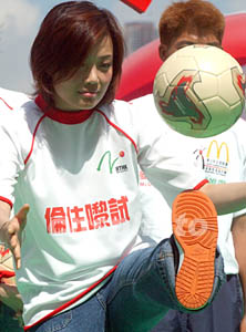圖:容祖兒參加迎接世界杯活動(dòng) 2002年05月05日 17:51 ![]() 香港歌星容祖兒,5月4日參加在青衣運(yùn)動(dòng)場(chǎng)舉行的“香港青少年迎接世界杯活動(dòng)”竭盡全力表演足球基本功。任晨鳴攝