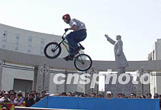 ![]() 極限輪滑選手七日在吉林市世紀(jì)廣場的毛澤東塑像前表演。中新社圖 寧秀英 攝