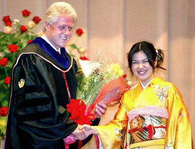 圖:美國前總統(tǒng)克林頓在日本接受名譽(yù)博士學(xué)位 2002年05月21日 17:14 21日在東京美國前總統(tǒng)克林頓被日本大學(xué)授予名譽(yù)法律博士學(xué)位。據(jù)悉,克林頓21日晚些時候還將與日本首相小泉純一郎舉行會談。圖為身穿傳統(tǒng)和服的大學(xué)生給克林頓獻(xiàn)花。法新供中新圖