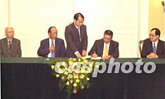 圖:澳門(mén)政府與銀河公司簽署博彩經(jīng)營(yíng)批給合同 2002年06月27日 11:13 ![]() 澳門(mén)特區(qū)行政長(zhǎng)官何厚鏵二十六日在澳門(mén)政府總部輿銀河娛樂(lè)場(chǎng)股份有限公司董事呂志和(左二)、范少朋(左一)簽署娛樂(lè)場(chǎng)幸運(yùn)博彩經(jīng)營(yíng)批給合同。中新社記者 李剛 攝