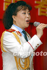 由150人組成的中國人民解放軍軍樂團強大陣容,7月6日晚將在香港紅磡體育館演出。7月4日下午,中國著名女高音歌唱家韓芝萍大校為來賓演唱演出晚會歌曲。任晨鳴 攝