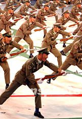 圖:駐港部隊(duì)“刺殺團(tuán)體操”為軍樂團(tuán)表演添彩 2002年07月06日 20:06 ![]() 七月六日晚,解放軍駐港部隊(duì)參加中國人民解放軍軍樂團(tuán)在香港的演出,他們表演的“刺殺團(tuán)體操”威風(fēng)凜凜,為軍樂團(tuán)演出錦上添花。潘索菲 攝