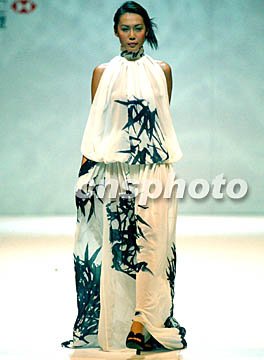 圖:港時裝節(jié)展示鄧達(dá)智的“水墨畫”女裙 2002年07月12日 10:11 ![]() “2003香港春夏時裝節(jié)”7月10日晚舉行香港十位頂尖設(shè)計師作品展示,模特身著設(shè)計師鄧達(dá)智的一件上繪墨竹全白透明沙裙款款款而行,宛如一幅流動的中國水墨國畫。任晨鳴 攝