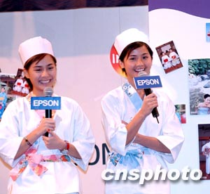 圖:香港偶像組合Twins推介打印機(jī) 2002年07月16日 18:43 ![]() 香港偶像組合Twins雙生兒蔡卓妍及鍾欣桐,7月16日打扮成為日本壽司師父出席EPSON新型彩色噴墨打印機(jī)推介會(huì),介紹Twins寫真珍藏集打印的照片。中新社傳真 洪少葵 攝