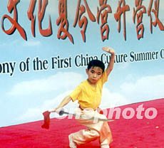 圖:天津霍元甲武術(shù)學(xué)校小朋友表演武術(shù) 2002年07月30日 14:47 ![]() 由中國(guó)對(duì)外文化交流協(xié)會(huì)主辦的首屆中國(guó)文化夏令營(yíng),七月二十九日在天津華夏未來(lái)少兒藝術(shù)中心開營(yíng)。天津霍元甲武術(shù)學(xué)校的小朋友在開營(yíng)儀式上表演武術(shù)。作者:孫志民