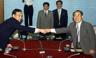 圖:韓國(guó)與朝鮮3日在金剛山舉行會(huì)談 2002年08月03日 19:44 ![]() 韓國(guó)與朝鮮3日下午在朝鮮金剛山旅館舉行了第七次部長(zhǎng)級(jí)會(huì)談?lì)A(yù)備性接觸的首次全體會(huì)議,雙方著重討論了部長(zhǎng)級(jí)會(huì)談在漢城舉行的時(shí)間和議題等問(wèn)題。圖為在金剛山韓國(guó)與朝鮮的代表握手。