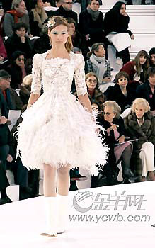 該品牌的高級(jí)定制服,向來(lái)就偏重經(jīng)典的傳統(tǒng)風(fēng)格,掌門人KarlLagerfeld沿襲了香奈兒女士穿著設(shè)計(jì)的靈感,白色平底靴,斜呢紋套裝還有白色透明褶皺硬紗翻領(lǐng),皆有可尋。