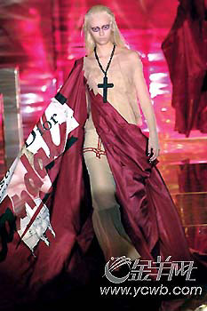 場(chǎng)地內(nèi)鋪天蓋地的紅色光影,眼眶涂抹厚重陰影,表情冰冷僵硬如同雕像的模特,身著鮮紅塔夫綢長(zhǎng)裙,發(fā)布會(huì)伊始就彌漫著宗教與政治相互交織的濃烈味道。一名模特兒的頸上,還繪上了法國(guó)大革命發(fā)生的年代———“1789”刺青圖案。繁復(fù)綴飾的馬甲、抓皺的波紋和高腰典雅的長(zhǎng)禮服,怵目驚心之下卻深刻地展現(xiàn)出風(fēng)華年代的衰敗感。就連最后謝幕時(shí),JohnGalliano也以華麗的舞劍串場(chǎng),來(lái)結(jié)束此季演出,精采十足。