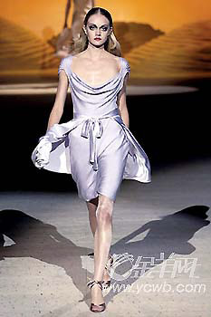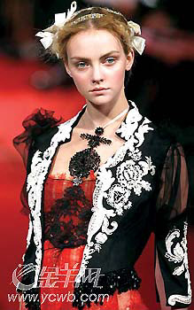 ChristianLacroix的時(shí)裝以設(shè)計(jì)復(fù)雜多變、風(fēng)格瑰麗多彩見(jiàn)稱,他在這一季的高級(jí)定制女裝展中,最搶眼的是一襲如夢(mèng)似幻的象牙色的雪紡紗短裙,紗裙上有精致的刺繡花朵,不論是用料和細(xì)節(jié)處理都極為細(xì)致,美麗得令人屏息。“金”是最能閃耀奢華的色調(diào),更被ChristianLacroix于今季帶有濃郁宮廷色彩的系列中大量運(yùn)用:鑲滿珠寶鉆飾的包款鞋,層疊在衣領(lǐng)、袖口或是裙擺的蕾絲荷葉邊,當(dāng)然還有各式各樣富麗貴氣的頭飾。配合瑰麗的設(shè)計(jì)風(fēng)格,充分表現(xiàn)出法國(guó)式的艷麗。
