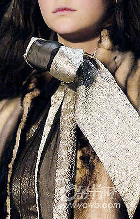 沙礫般的金屬色領(lǐng)巾系成夸耀的大蝴蝶結(jié),正好配襯皮草大衣的華麗,而拼接在金色領(lǐng)巾上的黑色薄紗則增加了幾分收斂的柔軟感覺(jué)。
