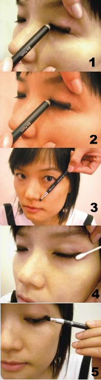 最近流行雙頭眼線筆,一頭是筆心、另一頭是暈染筆擦。若想讓眼線、眼影交界不要太明顯、以免不自然,只要把筆擦放在眼線上端與眼影交界處斜斜的、輕輕的推開,或以指腹幫忙,可柔化界線。