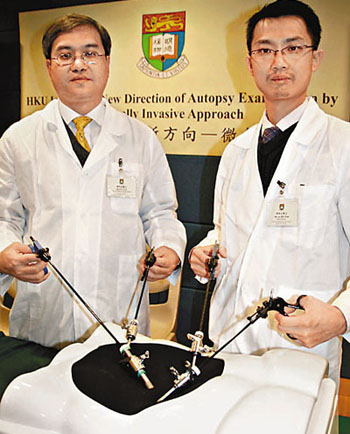 為了讓家屬較易接受驗尸,港大外科學(xué)系的微創(chuàng)專家研究利用微創(chuàng)技術(shù)驗尸,在腹部開四至五個直徑0.5至1厘米的傷口,利用腹胸腔鏡或內(nèi)窺鏡檢視胃、肝、腸和胰臟等胸腔內(nèi)的器官以尋找死因。