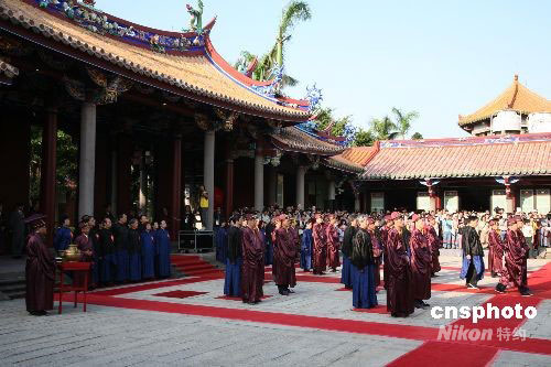 十月五日,臺(tái)北祭孔大典依舊制開始。著褐色古袍的引領(lǐng)人員引領(lǐng)“主獻(xiàn)官”臺(tái)北市長(zhǎng)郝龍斌及“分獻(xiàn)官”、“陪祭官”等入場(chǎng),郝龍斌及作為“分獻(xiàn)官”、“陪祭官”的十幾位臺(tái)北優(yōu)秀教師和各界代表,著藍(lán)色長(zhǎng)袍,黑色馬褂,依次走向固定位置佇立。中新社發(fā) 楊旭 攝