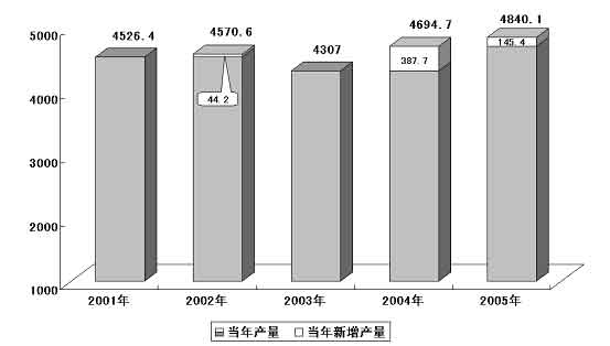 圖表三 “十五”期間糧食產(chǎn)量及增產(chǎn)情況 (單位:億公斤)