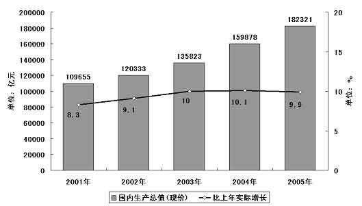 2005年,全國各族人民在中國共產(chǎn)黨的領(lǐng)導(dǎo)下,樹立和落實科學(xué)發(fā)展觀,加強和改善宏觀調(diào)控,團結(jié)奮進,銳意進取,國民經(jīng)濟呈現(xiàn)增長比較快、效益比較好、價格比較穩(wěn)的良好局面,完成了十屆全國人大三次會議審議通過的國民經(jīng)濟和社會發(fā)展計劃。