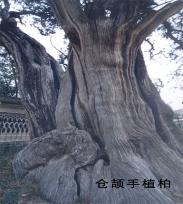 “倉頡手植柏”是廟內(nèi)最古老的柏樹。此柏腰圍7.28米,根圍9.3米,高17米,林業(yè)專家斷定它足有五千年樹齡。它完全可以同“黃帝手植柏”相媲美。相傳當(dāng)年倉頡選中這個墓穴后,便在此處栽植了這棵柏樹,所以叫“倉頡手植柏”。