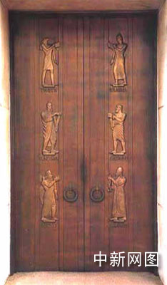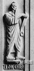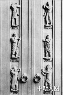 倉(cāng)頡(TS'ANG CHIE)的雕像是在東側(cè)大銅門上(左扇門第二個(gè))。國(guó)會(huì)圖書館對(duì)倉(cāng)頡的概括是“中國(guó)文學(xué)的庇護(hù)神”(the Chinese patron of writing)。顯然,這種評(píng)價(jià)比我們傳統(tǒng)上所認(rèn)為的倉(cāng)頡是造字圣人更高了一步。與倉(cāng)頡雕像放在一起的還有透特(埃及神話中的月神)、納布(美索不達(dá)米亞阿卡德人的神)、梵天(印度教三大神之一創(chuàng)造之神)、 腓尼基王子卡德摩斯(希臘神話中能夠“播種龍牙”的神) 以及古代波斯人的英雄塔赫穆拉斯。