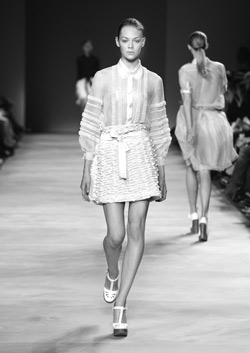 這一季的流行回歸到最單純的白色,但今夏的白色與往年大不相同。相比以往白色服飾給人的純潔印象,今年的白色系列挖掘的是白色性感的另一面:雪紡和蕾絲下面是十足的透明誘惑;鏤空、雕花、綴邊的“拼接”勾勒出女人的完美曲線;關(guān)注細(xì)節(jié)的刺繡、鑲嵌帶來的視覺感受,讓人回味無窮的精致性感……