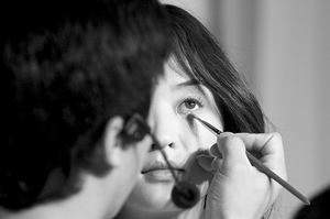 眼妝:用淡金色或銀白色眼影暈染在眼睛的四周,下眼瞼加上白色,能較好強調(diào)眼部。