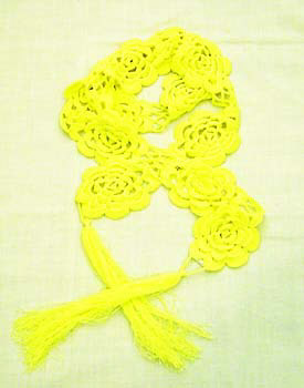 由花朵圖案拼接而成的薄圍巾,裝飾效果很強(qiáng),配裙裝或褲裝都不錯(cuò)。