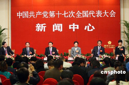 十月二十日晚,出席中共十七大的國家文化部副部長于幼軍、教育部副部長袁貴仁、全國婦聯(lián)副主席黃晴宜、共青團(tuán)中央書記處第一書記胡春華、國家廣播電影電視總局副局長趙實等代表就未成年人教育問題,在北京梅地亞中心接受中外媒體采訪。中新社發(fā) 毛建軍 攝