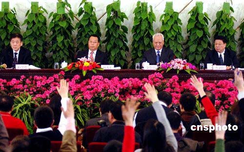 三月九日,十一屆全國(guó)人大一次會(huì)議在北京人民大會(huì)堂舉行記者招待會(huì),由勞動(dòng)和社會(huì)保障部部長(zhǎng)田成平、副部長(zhǎng)孫寶樹和民政部部長(zhǎng)李學(xué)舉、常務(wù)副部長(zhǎng)李立國(guó),就勞動(dòng)就業(yè)和社會(huì)保障問題答記者問。中新社發(fā) 王東明 攝