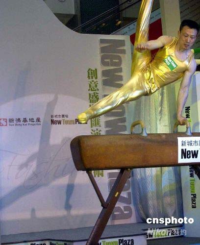 四月三十日,沙田一商場(chǎng)為慶祝奧運(yùn)馬術(shù)比賽在香港舉行,特別邀請(qǐng)亞特蘭大奧運(yùn)會(huì)鞍馬冠軍李東華作表演。李東華作為瑞士2008年奧運(yùn)會(huì)國(guó)家代表團(tuán)的特使,為瑞士贏得近百年來(lái)的首枚體操奧運(yùn)金牌。中新社發(fā) 譚達(dá)明 攝