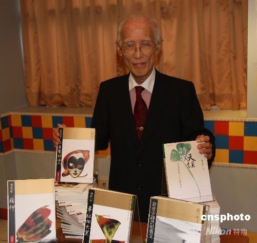為祝賀詩人余光中八十大壽,臺灣九歌出版社特意出版余光中最新詩集《藕神》、近十年的文學(xué)評論精選《舉杯向天笑》、翻譯英國名作家王爾德的劇本《不要緊的女人》等五本書,展現(xiàn)他在文學(xué)路上的成就。十月二日,臺灣藝文界提前為他祝壽,余先生在五本新書前留影。中新社發(fā) 耿軍 攝