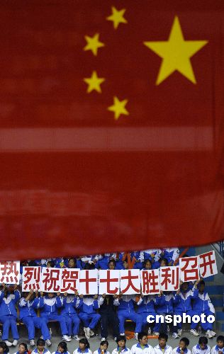 10月20日,2007-2008年全國男排聯(lián)賽的江蘇與上海男排比賽在江蘇省淮安體育館舉行,觀眾中的這幾位中學(xué)生打出了祝賀中國共產(chǎn)黨第十七大勝利召開的標(biāo)語。中新社發(fā) 淮安曹政 攝