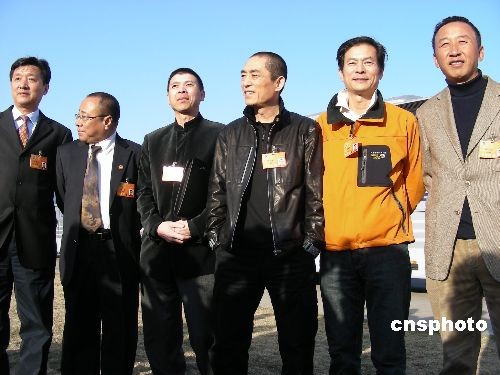 三月三日下午,全國(guó)政協(xié)十一屆一次會(huì)議開幕會(huì)后,著名導(dǎo)演張藝謀委員和他在北京電影學(xué)院的同學(xué)委員們相聚,在大會(huì)堂前合影。圖中左起至右分別是:張會(huì)軍、尹力、馮小剛、張藝謀、陳國(guó)星和馮小寧。其中,張會(huì)軍是北京電影學(xué)院院長(zhǎng),其余五人均為中國(guó)著名導(dǎo)演。中新社發(fā) 沈嘉 攝