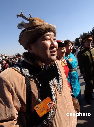 圖:鄂倫春族委員頭戴鹿角帽赴大會