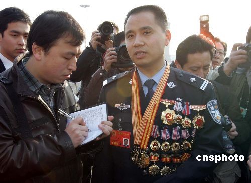 三月五日,來(lái)自江西的全國(guó)人大代表萬(wàn)凱身著警服、胸前佩滿勛章,出席十一屆全國(guó)人大一次會(huì)議開幕會(huì),吸引眾多記者。中新社發(fā) 潘索菲 攝