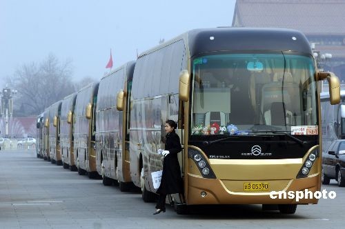 2008年3月8日,停在北京天安門廣場(chǎng)、全國(guó)政協(xié)十一次會(huì)議會(huì)場(chǎng)外的環(huán)保節(jié)能大巴。據(jù)悉,這種平均百公里油耗不到5升的環(huán)保大巴是首汽首次為“兩會(huì)”代表團(tuán)提供服務(wù)。此外,為營(yíng)造奧運(yùn)年氣氛,“兩會(huì)”服務(wù)車的內(nèi)前擋風(fēng)玻璃下方都擺放了北京奧運(yùn)會(huì)吉祥物福娃。中新社發(fā) 張朋 攝