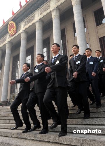 三月八日,全國政協(xié)十一屆一次會(huì)議第二次全體會(huì)議在北京人民大會(huì)堂舉行。會(huì)議結(jié)束后,身穿深色西服的工作人員整齊列隊(duì)走下大會(huì)堂的高臺(tái)階。中新社發(fā) 廖攀 攝