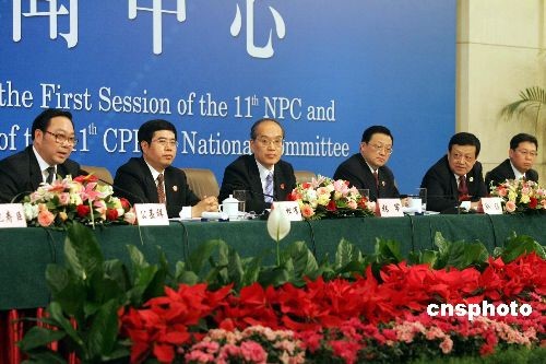 三月十五日下午,最高人民法院、最高人民檢察院六位官員在大會(huì)新聞中心就司法公正問(wèn)題,接受中外記者的集體采訪。圖為最高人民法院副院長(zhǎng)張軍(左三)、最高人民法院副院長(zhǎng)黃松有(左二)、全國(guó)人大代表、江蘇省高級(jí)人民法院院長(zhǎng)公丕祥(左一)、最高人民檢察院副檢察長(zhǎng)孫謙(右三)、最高人民檢察院檢察委員會(huì)專(zhuān)職委員戴玉忠(右二)、全國(guó)人大代表、黑龍江省人民檢察院檢察長(zhǎng)姜偉(右一)。中新社發(fā) 潘索菲 攝
