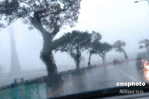 四月十九日,“浣熊”臺風登陸澳門,當?shù)貟炱鸢颂栵L球 ,街面狂風大作,暴雨傾盆,造成碼頭停航,橋梁封路。中新社發(fā) 史利 攝