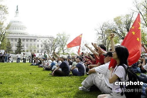 當(dāng)?shù)貢r(shí)間4月19日,近千名中國留學(xué)生和當(dāng)?shù)氐娜A僑華人在美國國會(huì)山前舉行示威活動(dòng),支持北京奧運(yùn),反對CNN丑化中國的評論。圖為千名留學(xué)生在國會(huì)山前振臂高呼:“不要歪曲報(bào)道!不要支持暴力!支持和平,支持奧運(yùn)!” 中新社發(fā) 邱江波 攝