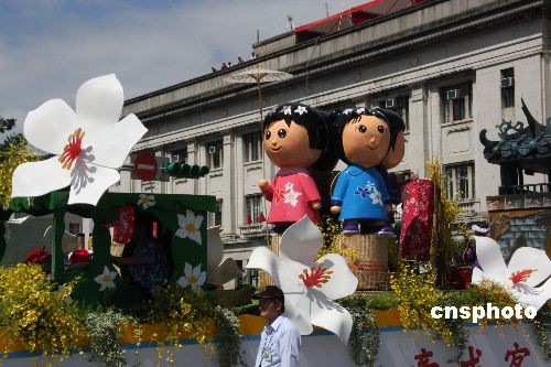十日上午,一些推廣本地經(jīng)濟、文化特色的花車,駛過臺北市區(qū)。圖中這輛由臺灣“客委會”布置的花車在宣傳如何弘揚客家文化。中新社發(fā) 耿軍 攝