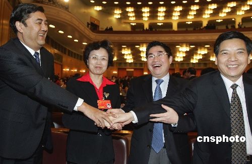 3月8日下午,十一屆全國人大一次會議在北京人民大會堂舉行第二次全體會議。當(dāng)日是“三八”國際婦女節(jié),大會開始前,在身材魁偉的新疆自治區(qū)主席努爾·白克力(左一)提議下,陜西省省長袁純清(右二)、云南省省長秦光榮(右一),共同祝賀青海省女省長宋秀巖節(jié)日快樂。中新社發(fā) 任晨鳴 攝