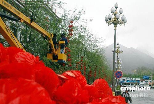 4月30日,拉薩市康昂東路,工人站在高高的吊車上懸掛燈籠,他們身后一串串火紅的小燈籠與柳樹翠綠的枝條隨風(fēng)擺動(dòng),構(gòu)成一道美麗的風(fēng)景線。為迎接北京奧運(yùn)會(huì)和慶祝五一節(jié),拉薩市投入大量人力物力裝扮曾受“3.14”事件影響的城市容貌,目前,拉薩被毀壞的公共設(shè)施已全面修復(fù),所有街道被點(diǎn)綴得清潔亮麗,令市民和游客流連忘返。中新社發(fā) 周波 攝
